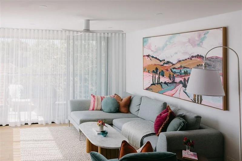 The power of finishing touches! After an extensive reno, we revelled in selecting new furniture for this beautiful waterfront apartment. Playing with some beautiful pops of colour, namely aqua, teal and magenta, we elevated what could have been another bland, beachy interior into something far more sophisticated. The large living room artwork (Wind Songs by Kezz Brett) was chosen by my gorgeous client and sets the scene for the rest of the design. The best compliment - she likened the apartment to a five star air bnb and has forgone weekends away for the perfect staycation!